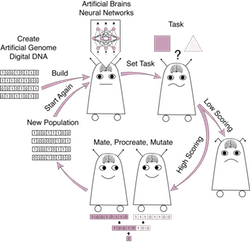 Evolutionary Robotics is a method for the automatic generation of robots or robot controllers that optimize behavior according to a certain criteraion. Neural network control parameters are initialized randomly and then optimized in closed-loop interaction interaction with the environment. This underspecification of the cognitive architecture leads to surprising, counter-intuitive and dynamically non-linear solutions that might be a nightmare to the human engineer, but plausible as naturally evolved solutions. |