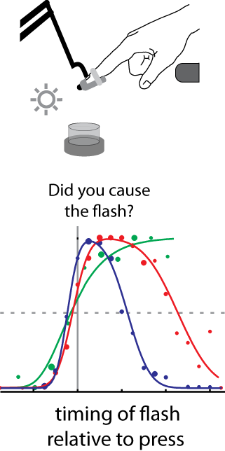 Temporal coherence between and temporal order of visual and motor/kinesthetic signals influences the sense of agency. How is agency perceptually inferred? On the other hand, we make predictions about the sensory consequences of our actions, which influence our sensory processing. How do our intentional actions influence the perception of stimulus timing and intensity? |