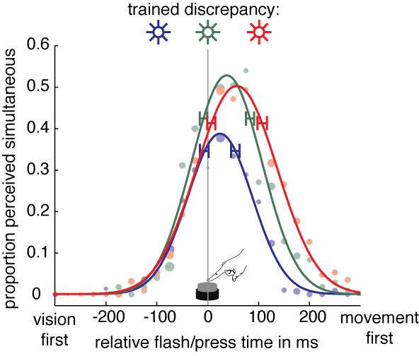 Examples of delayed tracking behavior (top) and recalibration of perceived visuomotor simultaneity (bottom)